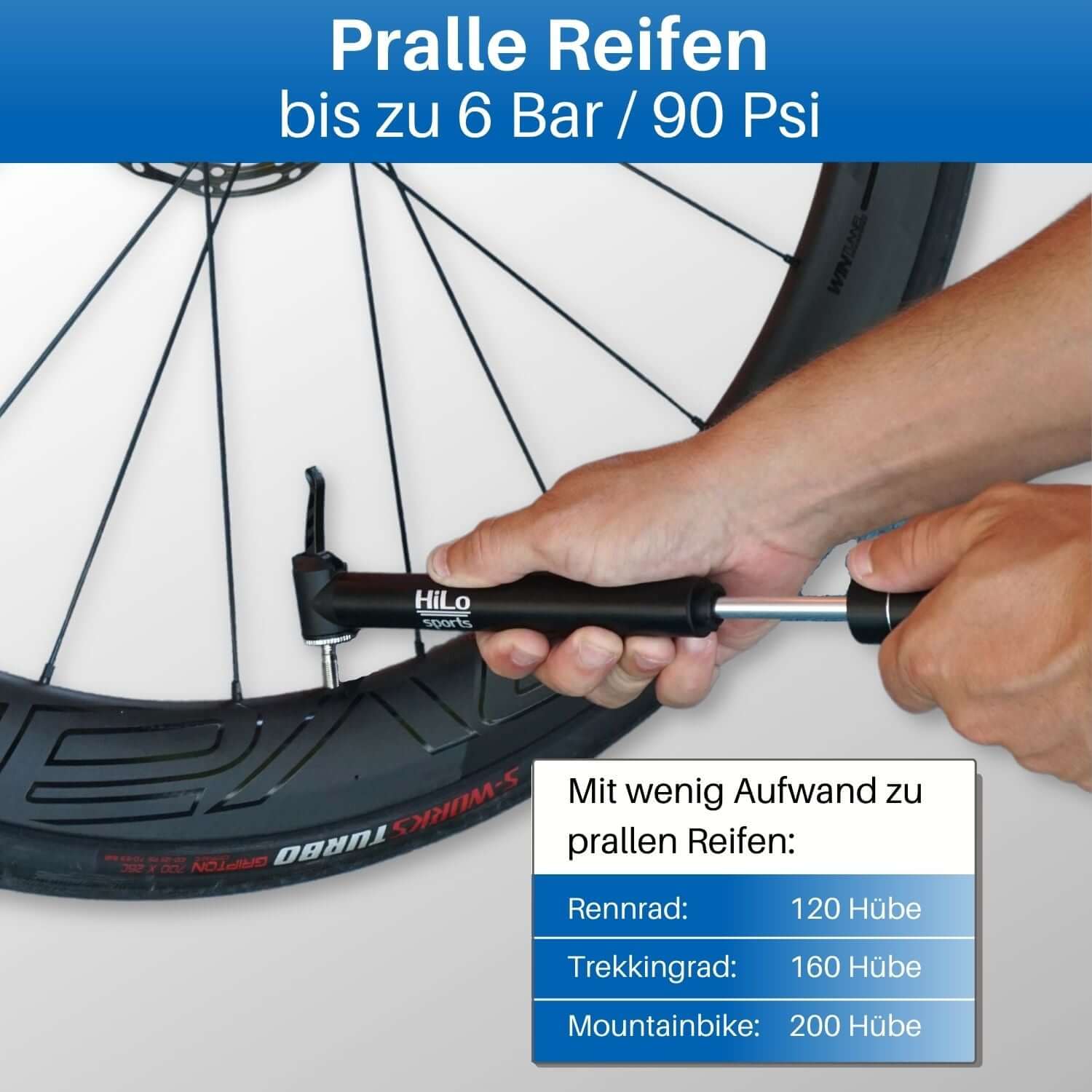 Passt dazu Vervollständige deine Auswahl: HiLo sports - Fahrradzubehör aus Leidenschaft… … ist der Grundgedanke unserer Marke. Die Produkte sind mit Liebe zum Detail ausgearbeitet und überzeugen durch einzigartige Funktionalität. Dank 100% Direktvertrieb ist HiLo sports günstiger als alteingesessene Markenprodukte.- Die beiden Gründer Rebekka und Sebastian FAQ - Häufig gestellte Fragen Auf bis zu wieviel bar kann ich meine Fahrradreifen mit der Minipumpe aufpumpen?Mit der Pumpe kannst du deine Reifen bis zu 6 bar, beziehungsweise bis zu 90 psi aufpumpen.Sollte ich die Mini Fahrradpumpe beim Radfahren immer dabeihaben?Du solltest immer einen Reifenheber, ein Flickset und eine Minipumpe dabeihaben. Im Falle eines Plattens ist das wertvoll.Kann ich alle Ventilarten mit der Rahmenpumpe aufpumpen?Ja, mit dieser kleinen Pumpe kannst du alle Ventilarten aufpumpen. Im Ventilkopf kannst du die beiden Gummi Teilchen umordnen. Somit kannst du Schrader, Presta und Dunlop Ventile aufpumpen. Einfaches aufpumpen Um deinen Fahrradreifen aufzupumpen legst du die Miniluftpumpe am Ventil an. Danach klappst du den Alu Hebel am Pumpenkopf hoch. Somit hält die Pumpe fest auf dem Ventil und du kannst loslegen. Passt für alle Ventile Mit der Fahrrad Minipumpe kannst du alle Ventile (DV, SV, AV) aufpumpen. AV Ventile passen von vornherein. Für DV und SV Ventile werden lediglich die beiden Gummi Teilchen im Pumpenkopf umgeordnet. (Siehe Produktbild 2) Aus Aluminium Die kleine Radpumpe besteht aus eloxiertem Aluminium. Das Material ist rostfrei und hält jedem Wetter stand. Der hochwertige Pump Mechanismus besteht ebenfalls aus Alu. Die Pumpe hat nur wenig Kunststoff-Anteil. Umweltfreundlich mit Hausverstand Wir verzichten grundsätzlich auf Kunststoff Verpackungen am Produkt. Das Fahrradzubehör wird in Versandkartons ohne Füllmaterial direkt zu dir gesendet. Zusätzlich wird nur Papier-Klebeband verwendet. Schneller Versand vom eigenen Lagerhaus Unsere fleißigen Versandmitarbeiter prüfen deine Bestellung gewissenhaft und verpacken sie sorgfältig. Von unserem Standort in Vorarlberg, Österreich wird dein Paket umgehend versendet. Firma aus Österreich Jedes einzelne Produkt wird mit Liebe zum Detail in Österreich ausgearbeitet. Vom HiLo sports Team in der Praxis getestet und sobald es optimal ist auf den Markt gebracht. Gemäß dem Motto: Von Radfahrern für Radfahrer. Passt auf alle Fahrradventile Du suchst eine Miniluftpumpe für unterwegs? Du willst jederzeit und von überall aus deinen Fahrradreifen aufpumpen können? Dann bist du bei der HiLo sports Tour Air Mini Fahrradpumpe genau richtig. Sie pumpt jedes Fahrradventil auf. DV, SV und AV Ventile können einfach mit dem Universal Pumpenkopf gepumpt werden. Einzig die Innenteile im Pumpenkopf werden je nach Ventil anders angeordnet. Um die Pumpe auf das passende Ventil einzustellen schraubst du zuerst das silberne Teil ab. Im Pumpenkopf sind dann 2 Gummiteilchen vorhanden. Für DV und SV Ventile ist das Zäpfchen des kleineren Gummiteilchens ins Pumpen-Innere gerichtet und das kleinere Loch vom größeren Gummiteilchen zeigt nach außen. Für das AV Ventil ist das Zäpfchen des kleineren Gummiteilchens nach außen gerichtet und das größere Loch vom größeren Gummiteilchen zeigt nach außen. Eine bebilderte Anleitung siehst du auf dem zweiten Produktbild. Funktioniert immer und überall Wie bereits beschrieben, kannst du mit der Mini Fahrradpumpe alle Ventile aufpumpen. Grundsätzlich gibt es 3 unterschiedliche Ventilarten. Das SV, DV und AV Ventil. Die Ventile haben zudem noch einige Synonyme. Hier ein Auszug, wie die Ventile noch genannt werden. SV Ventil (Sclaverand Ventil, Presta Ventil, französisches Ventil, Rennrad Ventil, Renn Ventil, Schlauchreifen Ventil). DV Ventil (Dunlop Ventil, Normal Ventil, Fahrrad Ventil, Blitz Ventil, Wood Ventil, Holland Ventil, englisches Ventil, Deutsches Ventil, Alligator Ventil). AV Ventil (Auto Ventil, PKW / KFZ Ventil, Motorrad Ventil, MTB Ventil). Du siehst mit der Rahmenpumpe bist du im Fall eines platten Reifens gut ausgerüstet und immer sicher unterwegs. Egal ob mit deinem E-Bike, Trekkingrad, Mountainbike (MTB) oder Rennrad. Die Pumpe funktioniert mit jedem Ventil und bei jedem Fahrrad. Mit wenig Aufwand zu prallen Reifen Die Mini Pumpe pumpt deinen Fahrradreifen problemlos bis zu 6 Bar (entspricht 90 Psi) auf. Um ein Rennrad komplett prall zu pumpen benötigst du ca. 120 Hübe, bei einem Trekkingrad sind es ca. 160 Hübe und bei einem Mountainbike (MTB) sind es 200 Hübe. Eine kleine Handluftpumpe ist eine empfehlenswerte Grundausstattung für jeden Fahrradfahrer. Auch Hobbyradfahrer empfehlen wir wärmstens immer eine kleine Notfallpumpe mit dabei zu haben. Sollte dein Reifen Luft verlieren oder falls du einen Platten hast, ist die kleine Tour Air Mini Pumpe extrem hilfreich. Für den Gebrauch zu Hause empfehlen wir dir eine Standpumpe zu nutzen. Dort kannst du dann auch den genauen Luftdruck mit dem Manometer kontrollieren. Unterwegs genügt auch eine kleine Luftpumpe ohne Manometer. Mit einer Länge von nur 19cm kannst du sie im Radtrikot oder im Fahrradrucksack mittransportieren. Aus hochwertigem Aluminium Der komplette Pumpen Mechanismus besteht aus hochwertigem eloxiertem Aluminium Material. Nur ein geringer Anteil der Pumpe ist aus Kunststoff gefertigt. Dadurch erhältst du den extremen Vorteil, dass die Pumpe länger hält und exakter pumpt. Durch die Eloxal-Schicht kann das Material nicht rosten und bleibt dir lange Zeit erhalten. Zudem ist die kleine Rahmenpumpe durch die eloxierte Schicht kratzfest. Auch der Hebel besteht aus Aluminium Material. Durch die angenehm lange Größe des Hebels, lässt sich der Pumpenkopf kinderleicht am Fahrradventil arretieren. Der Hebel ist leichtgängig und die Pumpe hält bombenfest auf jedem Fahrradventil. Die Fahrrad Minipumpe hat ein Gewicht von nur 90g. Die Länge der Pumpe in eingefahrenem Zustand beträgt 19cm und der Durchmesser am Griff be