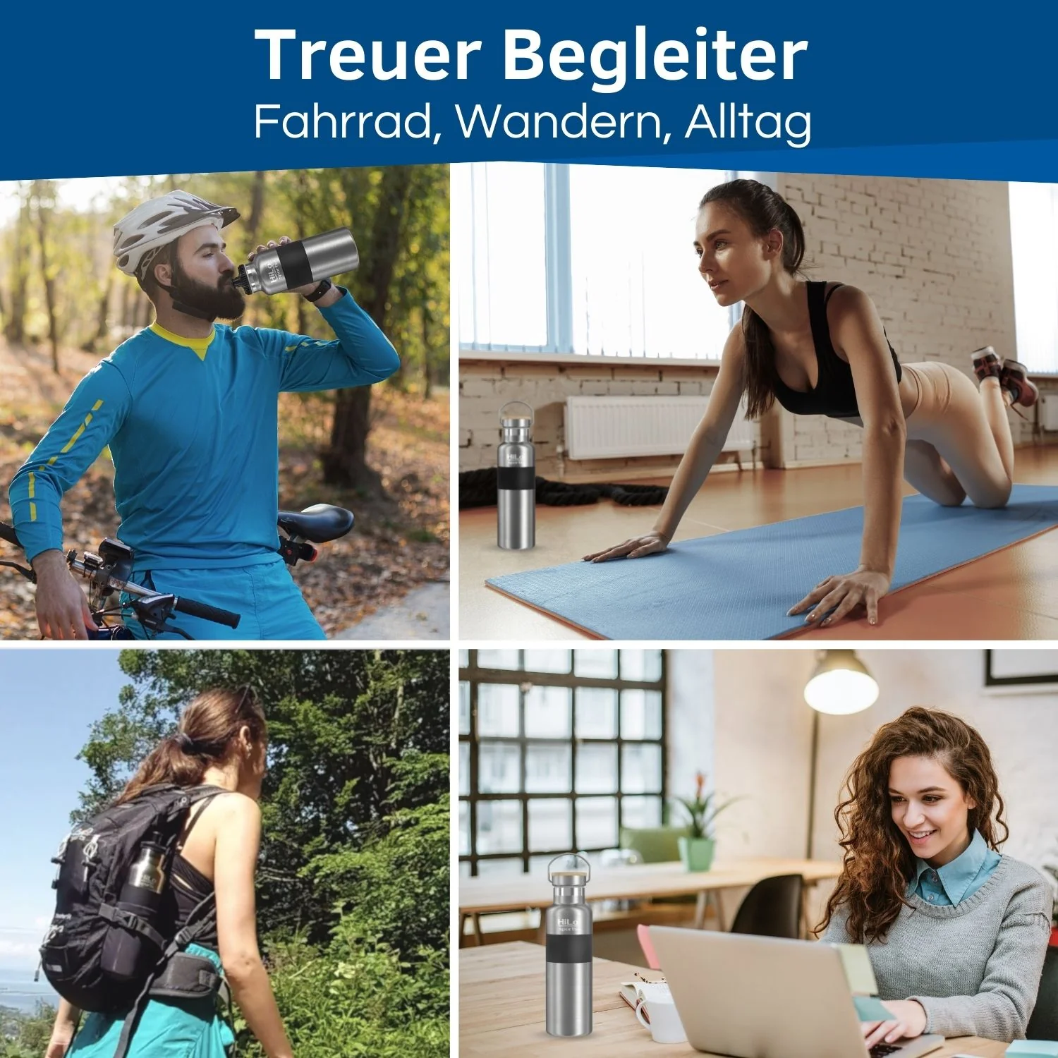 Passt dazu Vervollständige deine Auswahl: HiLo sports - Fahrradzubehör aus Leidenschaft… … ist der Grundgedanke unserer Marke. Die Produkte sind mit Liebe zum Detail ausgearbeitet und überzeugen durch einzigartige Funktionalität. Dank 100% Direktvertrieb ist HiLo sports günstiger als alteingesessene Markenprodukte.- Die beiden Gründer Rebekka und Sebastian FAQ - Häufig gestellte Fragen Ist die Thermo Fahrradflasche für kohlensäure-haltige Getränke geeignet?Bei der Nutzung des Bambus / Edelstahl Drehverschlusses kannst du ohne Probleme kohlensäure-haltige Getränke in die Flasche einfüllen. Bei der Nutzung der Flasche mit dem Sportverschluss raten wir von kohlensäure-haltigen Getränken ab. Da ein Überdruck entstehen kann und der Sportverschluss nicht 100% dicht ist.Was sind die Vorteile der isolierten Fahrrad Trinkflasche?Das Premium 304 (18/8) Edelstahl Material bietet maximale Vorteile. Die Trinkflasche ist extrem langlebig. Sie ist antibakteriell, rostfrei und geschmacksneutral. Ist die Trinkflasche auslaufsicher?Durch die Silikon Dichtungen in den Verschlüssen ist die Thermo Trinkflasche auslaufsicher. Einzig bei der Nutzung des Sportverschlusses in Kombination mit kohlensäure-haltigen Getränken kann ein Überdruck entstehen und die Flasche könnte undicht werden.Ist die Edelstahl Rad Trinkflasche für Fahrradhalter geeignet?Ja, mit dem Durchmesser von 7,3cm passt die Radflasche in alle Standard Fahrrad Flaschenhalter. Dank des schwarzen Silikon Rings ist die Flasche vor Kratzern geschützt und das Klimpern im Flaschenhalter wird vermindert. Perfekt als Fahrradflasche Durch den Silikon Schutzring ist die Edelstahl Fahrrad Trinkflasche im Halter vor Kratzern geschützt. Der Schutzring vermindert lästiges Klimpern im Halter. Mit ihrem Durchmesser von 7,3cm passt sie in alle Flaschenhalter. Premium Edelstahl Material Die Fahrrad Trinkflasche Thermo besteht aus hochwertigem 304 (18/8) Stahl. Sie ist langlebig, geschmacksneutral, rostfrei und antibakteriell. Zudem ist sie im Labor überprüft und komplett ohne Weichmacher und frei von BPA. Inklusive 2 Verschlüsse Die beiden Verschlüsse stellen sicher, dass du die Fahrrad Trinkflasche zusätzlich zum Radfahren auch bei anderen Aktivitäten verwenden kannst. Die Edelstahl Fahrradflasche ist auch super im Büro, im Gym oder beim Sport. Umweltfreundlich mit Hausverstand Wir verzichten grundsätzlich auf Kunststoff Verpackungen am Produkt. Das Fahrradzubehör wird in Versandkartons ohne Füllmaterial direkt zu dir gesendet. Zusätzlich wird nur Papier-Klebeband verwendet. Schneller Versand vom eigenen Lagerhaus Unsere fleißigen Versandmitarbeiter prüfen deine Bestellung gewissenhaft und verpacken sie sorgfältig. Von unserem Standort in Vorarlberg, Österreich wird dein Paket umgehend versendet. Firma aus Österreich Jedes einzelne Produkt wird mit Liebe zum Detail in Österreich ausgearbeitet. Vom HiLo sports Team in der Praxis getestet und sobald es optimal ist auf den Markt gebracht. Gemäß dem Motto: Von Radfahrern für Radfahrer. Aus Edelstahl, für deine Gesundheit Eine Fahrrad Trinkflasche aus Edelstahl, danach wurde von unseren Kunden häufig gefragt, und hier ist sie nun. Die HiLo sports „Steel 600 Iso“ Edelstahl Rad Trinkflasche. Edelstahl ist ein sehr gefragtes Material und das nicht umsonst. Denn Edelstahl vereint viele Vorteile in einem Produkt. Jedoch ist es gar nicht so einfach eine Edelstahl Flasche so zu produzieren, sodass sie auch perfekt als Fahrrad Trinkflasche einsatzbereit ist. Doch das haben wir nun für dich geändert. Durch das schwarze Silikonband passt sie in Flaschenhalter, ohne zu klimpern. Und dazu erhältst du alle Vorteile vom Edelstahl Material. Edelstahl ist hygienisch, da es antibakteriell ist. Es ist zudem korrosionsbeständig, bedeutet Edelstahl rostet nicht. Zudem ist es temperaturbeständig, bedeutet warme Getränke bleiben warm und Kalte bleiben kalt. Thermo Isolier Funktion Deine Getränke bleiben 24 Stunden lang eiskalt und 12 Stunden lang heiß. Dank der Vakuum Isolier-Kammer der Radflasche entsteht eine Thermo Isolier Funktion. Im Gegensatz zu Standard Kunststoff Flaschen behält dein Getränk seine angenehme Temperatur. Damit ist im Sommer Schluss mit lauwarmem Wasser. Dein Getränk bleibt während der Radfahrt angenehm kalt. Und im Winter kannst du Heißgetränke, wie deinen Tee, mitnehmen und dieser behält 12 Stunden lang seine heiße Temperatur. Dadurch bleibt dir während der Radfahrt warm. Du kannst die Edelstahl Fahrradflasche natürlich auch im Büro nutzen. Durch das hochwertige 18 / 8 (304) Edelstahl Material ist die Flasche natürlich lebensmittelecht und komplett hygienisch. Sie ist vollkommen geschmacksneutral. So kannst du deine Getränke ohne lästigen, künstlichen Beigeschmack genießen. Bestimmt auslaufsicher Mit der Thermo Fahrradflasche erhältst du 2 Verschlüsse mit dazu. Der schwarze Verschluss eignet sich perfekt zum Radfahren und für sportliche Aktivitäten. Dieser ist mit einem Trink-Noozle ausgestattet, damit du während dem Radfahren trinken kannst. Der andere Verschluss ist ein Edelstahl Schraubverschluss mit Bambusdeckel. Beide Verschlüsse erhältst du jeweils inklusive eines Dichtungs-Ringes. Die Dichtungs-Ringe sorgen dafür, dass bestimmt kein Wasser ausläuft. Damit bleiben deine Sporttasche und dein Rucksack trocken. Die Edelstahl Trinkflasche für Fahrrad hält somit in jeder Lebenslage dicht. Die beiden unterschiedlichen Verschlüsse kannst du so austauschen, wie du sie gerade benötigst. Für alle sportlichen Aktivitäten raten wir dir zum schwarzen Verschluss mit Noozle. Für deinen Weg ins Büro oder für zu Hause raten wir dir zum Edelstahl Verschluss mit Bambusdeckel. Für den Geschirrspüler geeignet Die Reinigung der Edelstahl Flasche ist kinderleicht. Du kannst sie einfach in der Spülmaschine waschen. Davor empfehlen wir dir den schwarzen Silikon Ring abzunehmen. Denn es können sich Reste im Geschirrspüler unter dem Si
