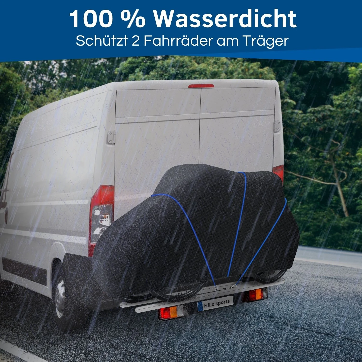 Kundenstimmen Erfahrungsberichte von Kunden Top Qualität! Nach 2000 gefahrenen Kilometern, mit einer Durchschnittsgeschwindigkeit von ca. 120 km/h, alles in Ordnung! Keine Beschädigungen, bei Wind und Wetter! Nach tagelanger Fahrt im Regen sind die Räder trocken und sauber geblieben. Die Qualität lässt keine Wünsche offen. Die Befestigung ist sehr einfach Die Hülle passt perfekt über 2 große Ebikes. Sie lässt sich leicht mit dem mitgelieferten Gummiband fixieren. Sie bläht sich auch bei Fahrten über 100 km/h nicht auf. Passt dazu Vervollständige deine Auswahl: HiLo sports - Fahrradzubehör aus Leidenschaft… … ist der Grundgedanke unserer Marke. Die Produkte sind mit Liebe zum Detail ausgearbeitet und überzeugen durch einzigartige Funktionalität. Dank 100% Direktvertrieb ist HiLo sports günstiger als alteingesessene Markenprodukte.- Die beiden Gründer Rebekka und Sebastian FAQ - Häufig gestellte Fragen Ist die Hülle hinten offen oder komplett geschlossen?Die Fahrradträger Schutzhülle ist rundherum verschlossen, nur unten ist sie offen.Ist der Transportschutz wasserdicht oder wasserabweisend?Die Hülle ist komplett wasserdicht. Auf der Innenseite ist eine dicke PU-Beschichtung. Zusätzlich sind alle Nähte versiegelt.Was ist die genaue Zusammensetzung des Materials?Die genaue Materialangabe ist 600D Ripstop Stoffgewebe mit PU-Beschichtung innen.Bei welchen Fahrzeugen empfiehlt HiLo sports die Nutzung dieser Heckträger Schutzhülle für 2 E-Bikes?Bei Fahrzeugen, welche von der Höhe und Breite die Kombination von Heckträger, Bikes und Schutzhülle komplett im Windschatten verdecken. Weiters muss jegliche damit verbundene Vorschrift erfüllt werden. Bei Unsicherheiten zu diesem Produkt greifen: HiLo sports Transportschutz Set Reißfestes Gewebe Die Abdeckung für den Fahrradträger besteht aus hochwertigem 600D Ripstop. Das Ripstop Gewebe hält in Kombination mit dem Seil langen Fahrten stand. Inklusive 6 Meter Seil Damit die Fahrradabdeckung über den Bikes am Heckträger nicht flattert, ist ein starkes Seil beigelegt. Der Verschluss funktioniert mit einem Sicherheits-Karabiner. Schützt dein E-Bike vor Regen Die Heckträger Fahrradschutzhülle hat innen eine dicke wasserdichte Beschichtung. Zudem sind alle Nähte mit einem speziellen Heiß-Press-Verfahren versiegelt. So, ist dein Fahrrad perfekt vor Regen und Spritzwasser geschützt. Umweltfreundlich mit Hausverstand Wir verzichten grundsätzlich auf Kunststoff Verpackungen am Produkt. Das Fahrradzubehör wird in Versandkartons ohne Füllmaterial direkt zu dir gesendet. Zusätzlich wird nur Papier-Klebeband verwendet. Schneller Versand vom eigenen Lagerhaus Unsere fleißigen Versandmitarbeiter prüfen deine Bestellung gewissenhaft und verpacken sie sorgfältig. Von unserem Standort in Vorarlberg, Österreich wird dein Paket umgehend versendet. Firma aus Österreich Jedes einzelne Produkt wird mit Liebe zum Detail in Österreich ausgearbeitet. Vom HiLo sports Team in der Praxis getestet und sobald es optimal ist auf den Markt gebracht. Gemäß dem Motto: Von Radfahrern für Radfahrer. Optimaler Transportschutz für 2 Fahrräder Die Fahrradschutzhülle für 2 E-Bikes Heckträger schützt deine Fahrräder zuverlässig während des Transports. Ob an einem Wohnmobil oder einem Fahrzeug mit Anhängerkupplung – diese Schutzhülle bewahrt deine Fahrräder vor Regen, Schmutz und Spritzwasser. Dank der großzügigen Maße von 210 cm Länge, 115 cm Höhe und 80 cm Breite passen selbst große Fahrräder oder E-Bikes mit breiten Lenkern problemlos darunter. Damit wird diese Abdeckung für Fahrradträger zur idealen Wahl für dich, wenn du deine Fahrräder sicher und sauber ans Ziel bringen möchtest. Robustes und wasserdichtes Material Gefertigt aus hochwertigem 600D Ripstop-Gewebe, bietet die Schutzhülle außergewöhnliche Reißfestigkeit und Langlebigkeit. Die PU-Beschichtung auf der Innenseite sorgt für 100% Wasserdichtigkeit, während verschweißte Nähte zusätzlichen Schutz vor eindringender Feuchtigkeit bieten. Damit ist die Fahrradabdeckung perfekt für den Einsatz bei starkem Regen. Sichere Befestigung mit Spannseil Ein Highlight der Schutzhülle ist das im Lieferumfang enthaltene 6 Meter lange Sicherheitsseil mit Karabinerverschluss. Dieses sorgt dafür, dass die Fahrradträger Schutzhülle selbst bei Fahrtwind stabil bleibt und nicht verrutscht. Ergänzt durch ein Fixierband in der Mitte sowie Zugbänder vorne und hinten sitzt die Hülle sicher über deinen Fahrrädern. Diese durchdachte Befestigung macht die Anwendung nicht nur praktisch, sondern schützt auch effektiv vor Beschädigungen durch Flattern. Vielseitige Nutzungsmöglichkeiten Die Fahrradschutzhülle für 2 E-Bikes Heckträger ist für alle gängigen Fahrzeuge geeignet, deren Heckträger im Windschatten des Fahrzeugs liegt. Die Hülle bietet zuverlässigen Schutz auf jeder Reise. Sie eignet sich ebenso hervorragend für den Transport wie für die Lagerung von Fahrrädern. Dank ihrer universellen Maße passt sie problemlos über die meisten Fahrräder und E-Bikes. Einfache Handhabung und hoher Komfort Die Anwendung der Fahrradträger Schutzhülle ist denkbar einfach. Innerhalb weniger Minuten lässt sich die Hülle mit dem mitgelieferten Seil und den Zugbändern anbringen. Das Fixierband sorgt für zusätzliche Stabilität, während die großzügigen Maße eine unkomplizierte Handhabung ermöglichen. Selbst große Fahrräder oder E-Bikes lassen sich ohne Kraftaufwand abdecken. So sparst du Zeit und profitierst von einem zuverlässigen Transportschutz für deine Räder. Nachhaltige Qualität von HiLo sports HiLo sports legt großen Wert auf Nachhaltigkeit und Qualität. Die Fahrradabdeckung Heckträger wird umweltfreundlich und plastikfrei verpackt. Versandkartons ohne Füllmaterial und Papierklebeband unterstreichen das Engagement für die Umwelt. Gleichzeitig überzeugt das Produkt durch hochwertige Verarbeitung und durchdachtes Design, das von Rad
